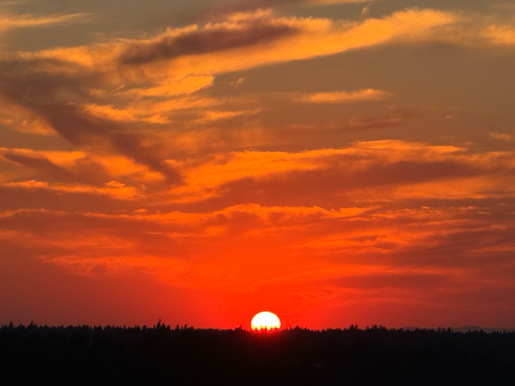 Driving along High Drive on Spokane’s South Hill on July 8th, I pulled over to admire the sunset. A joined a small group of other watchers, individually and in pairs, who were transfixed by the intense reds that smoke and sun can create for a few, wonderful minutes.