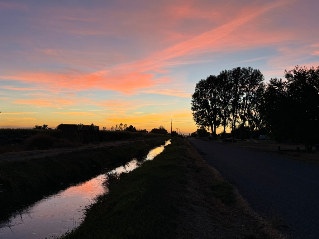 An irrigation canal glows with sunset colors near the farmhouse where we camped just north of the Snake River canyon and Twin Falls.