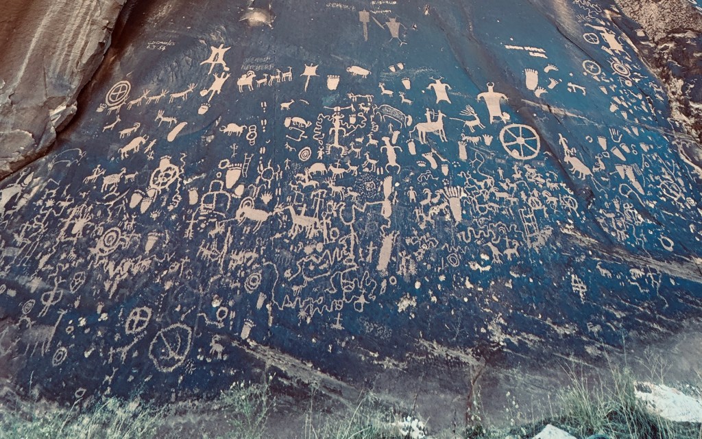 Driving south of Moab, Utah into Canyonlands National Park, we stopped at the Newspaper Rock petroglyphs. A mix of native and immigrant signs scratched into the dark sheen on a large wall. Can you find the foot with six toes?