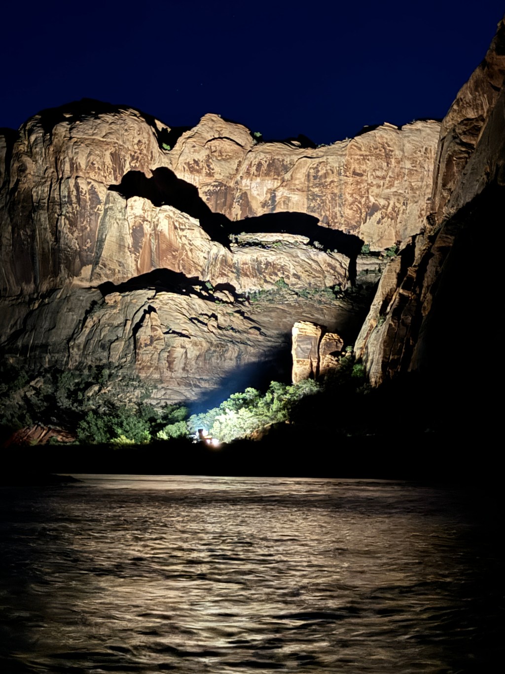 Flood lights highlight the stepped cliffs during our evening cruise up the Colorado River canyon.