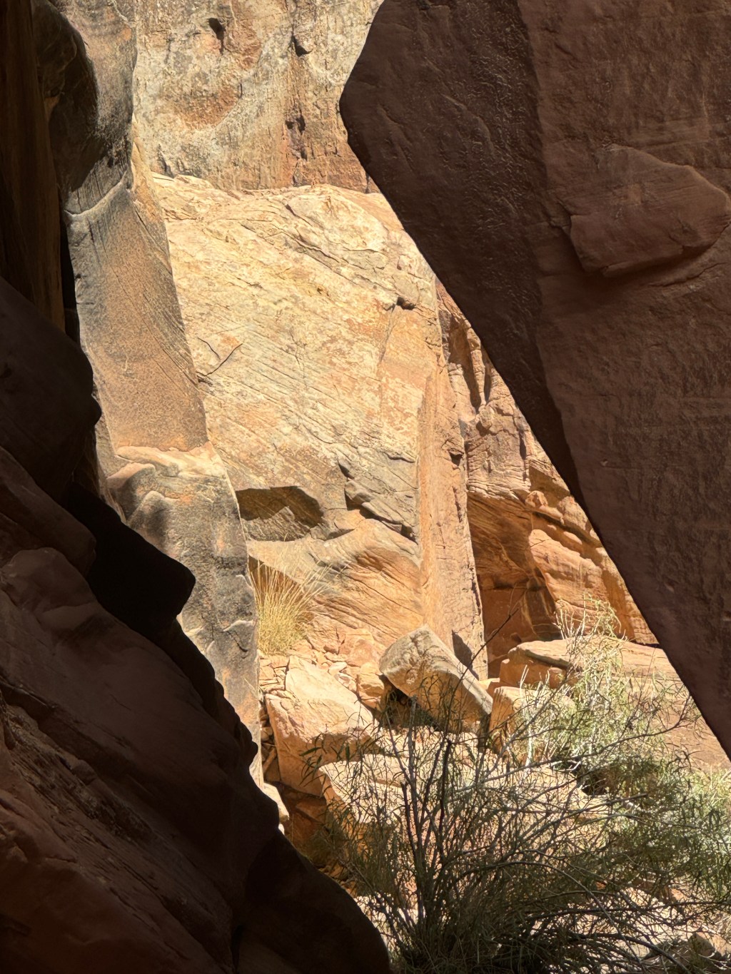 Hiking back out of the Grand Wash in Capitol Reef National Park, I found two large slabs of rock that had fallen off the cliffs above and framed this view of the canyon terrain between them.
