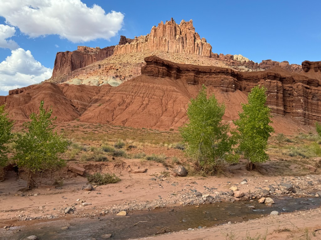 The Castle rocks near the Capitol Reef National Park’s visitor center stand atop layer after layer of sedimentary rocks of various shades and ages.