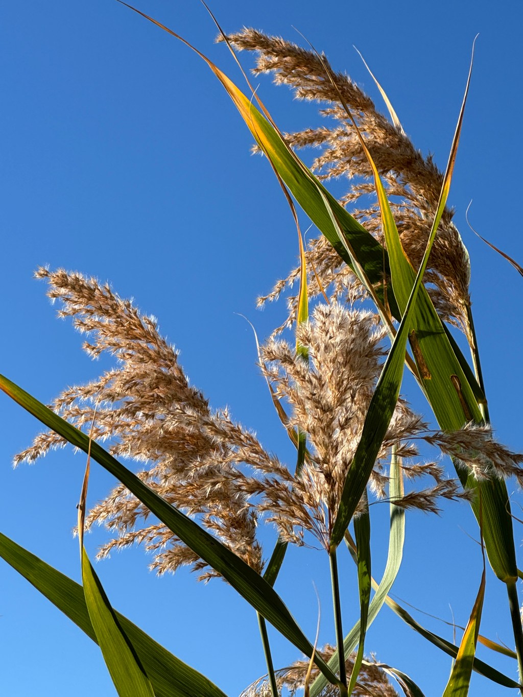 Between our campground and the mostly dry stream bed, you can walk past grasses that tower over head against the clear blue sky.