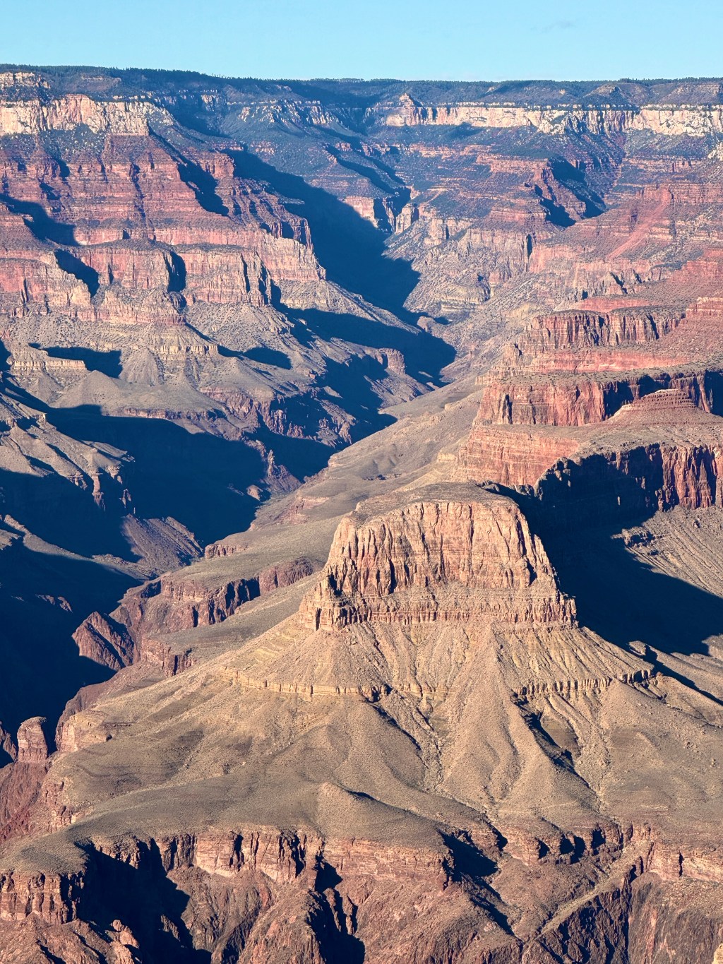 That deep ravine opposite Mather Point is the Bright Angel Canyon, marking the most popular trail from the Colorado River up to the North Rim. Afternoon light begins to make the shadows more distinct.