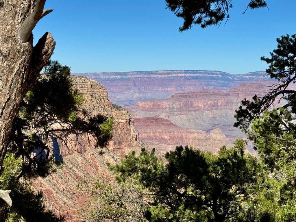 The view of the canyon from between trees near Hermits Rest. It sounds like the “hermit” who lived near here was a kind fellow who guided visitors down into the canyon a century ago.