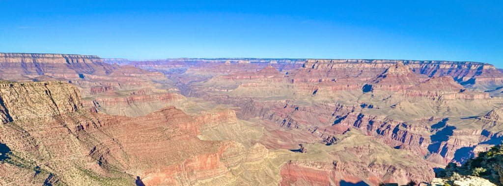 A morning drive to the eastern end of the South Rim earned us this view looking west into the canyon from Navaho Point. It’s all pastels and few shadows to give you a feel for how far you are looking (about 15 miles) or how far down it goes (over 4000 feet).
