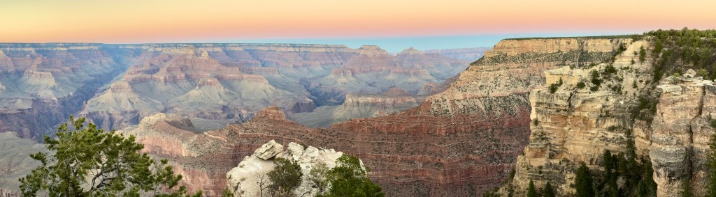 Just after sunset, the view from Mather Point is the Grand Canyon colored with soft pastels, including the orange sky above. A memorable evening!