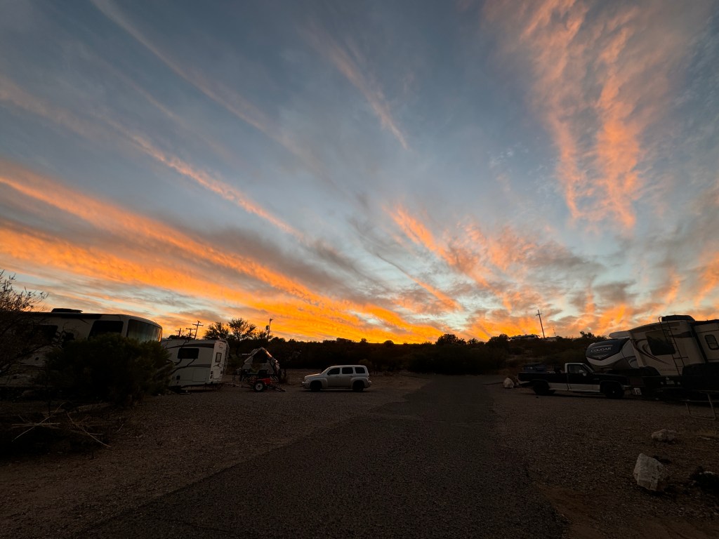 Mimicking a sunrise, the sky’s contrails shoot out from the horizon above our campground.
