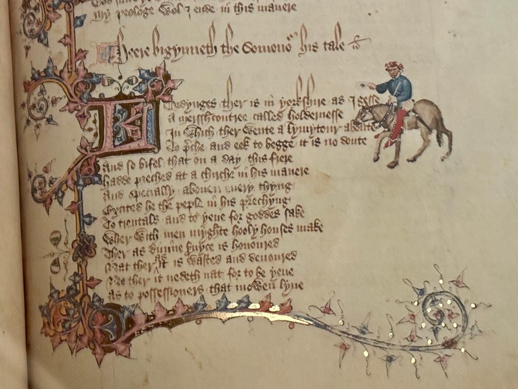 This facsimile of an original parchment of Chaucer’s ‘The Canterbury Tales’ (owned by the library) features gold illuminations, just like the original.