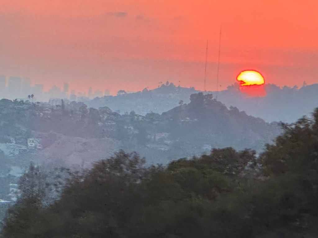 Driving through the foothills near Pasadena, I caught the setting sun as it descended into a red-orange horizon. That’s the towers of downtown Los Angeles at the left, fading into the haze. We were long enough after the fires of January that it’s dust rather than smoke that gives it this look.