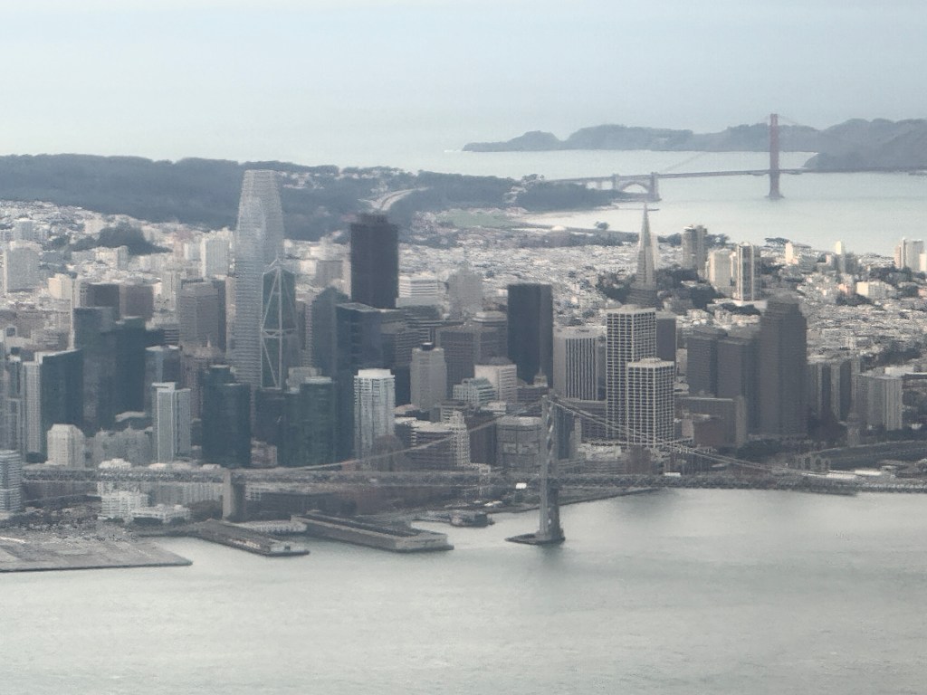 Flying into the Bay Area, I caught this view of downtown San Francisco. The Golden Gate Bridge is in the upper right, the Bay Bridge in the lower center, and the city’s skyline fills the middle of the image.