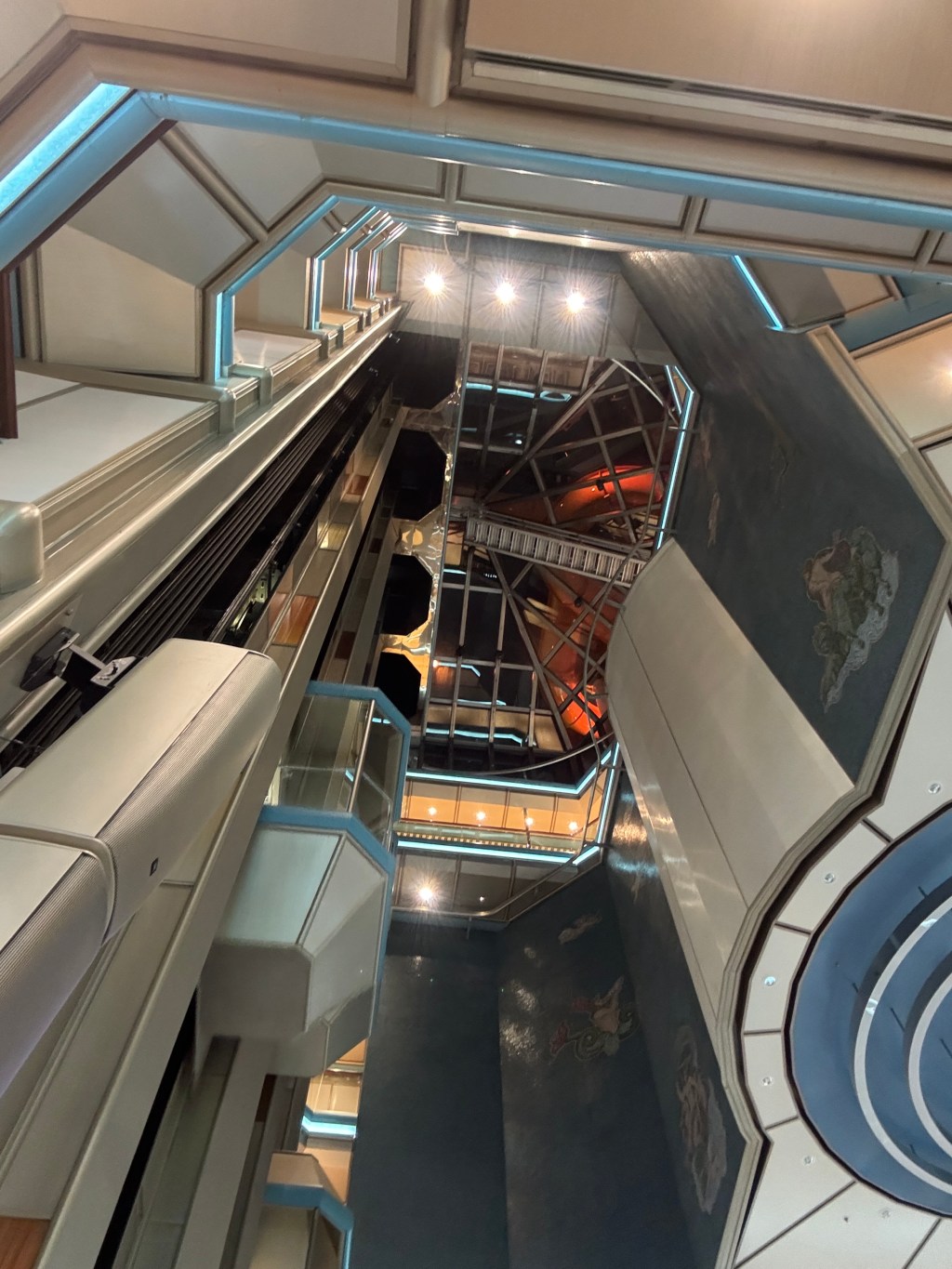 A glass elevator rises in the 10-story atrium on the Carnival Radiance cruise ship. The lines and lights create an interesting image.