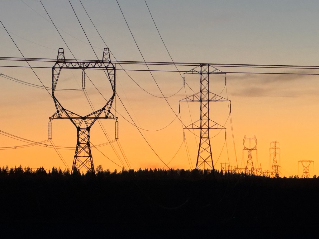 Towers holding up their high-tension power lines march into the sunset on a clear, winter’s evening near our home.
