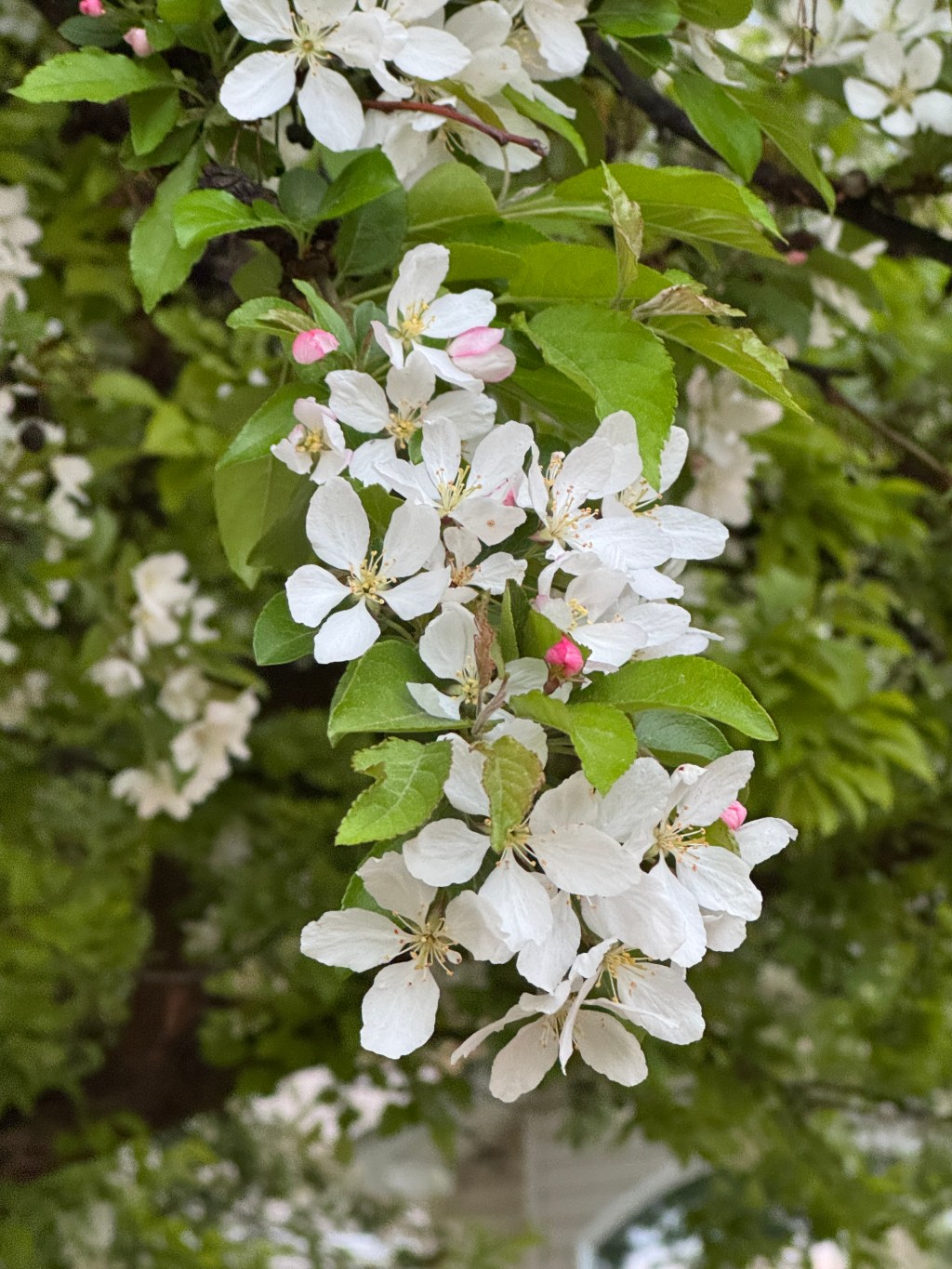 Is it an apple or a crabapple? Whichever, this tree blooming in our neighborhood was a delicious sight. I enjoy focusing in on one bunch of blooms to highlight their delicate shapes.