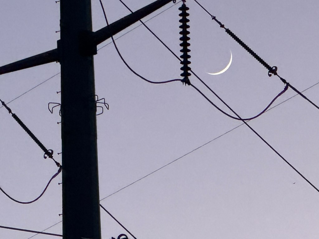 The new moon rose through the wires of a power pole near our house on a spring evening.