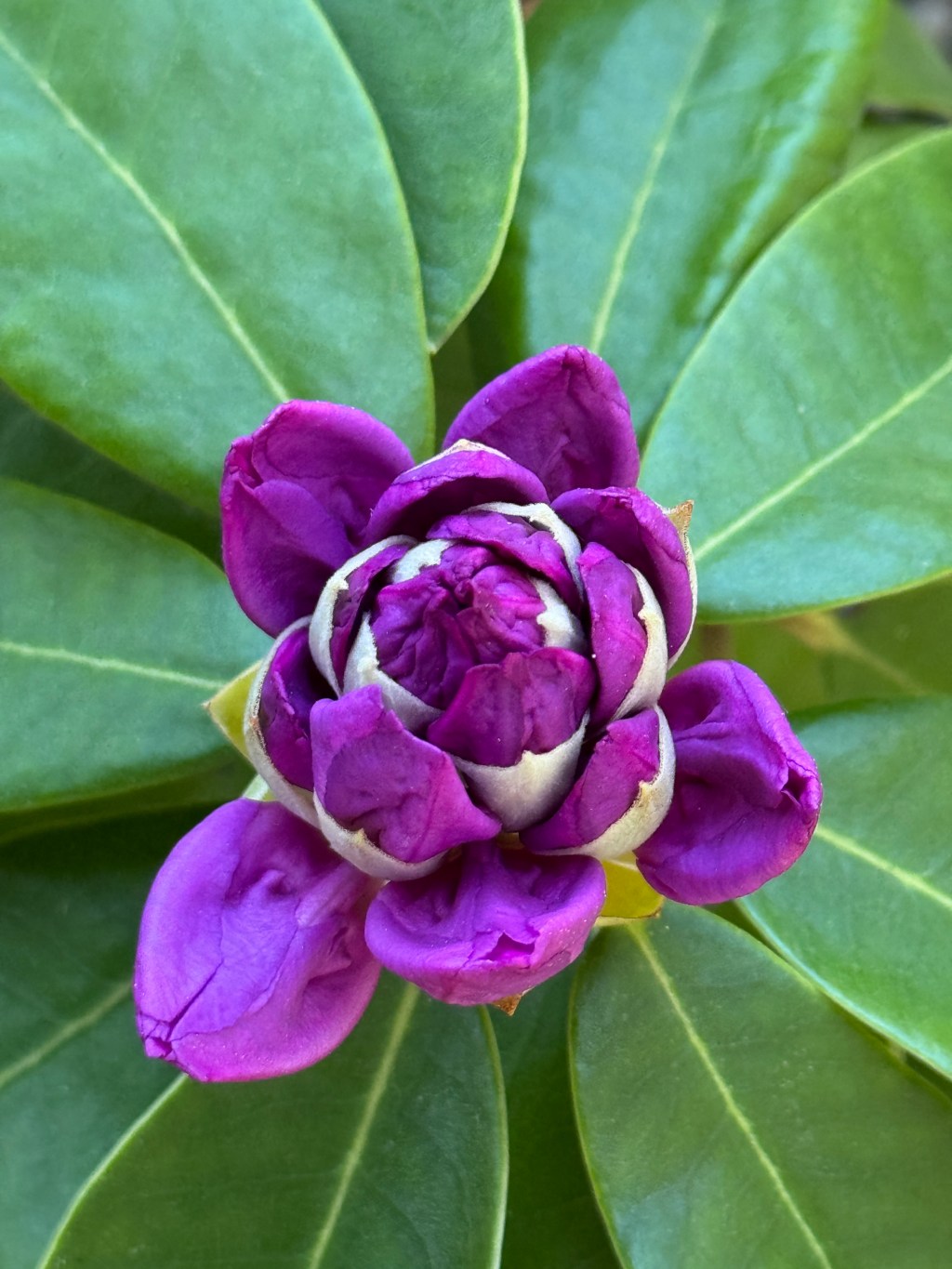 The lilac-colored rhododendron in our front garden began to open deep purple buds in late May.
