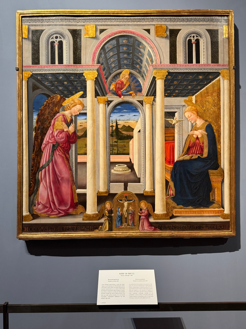 This 1464 painting by Neri di Bicci in the Accademia Gallery has the classic geometry of Renaissance artwork, setting the Angel Gabriel’s visit to Mary in a Greek temple. Follow the lines of the ceilings to find the perspective’s vanishing point in the painting’s center.