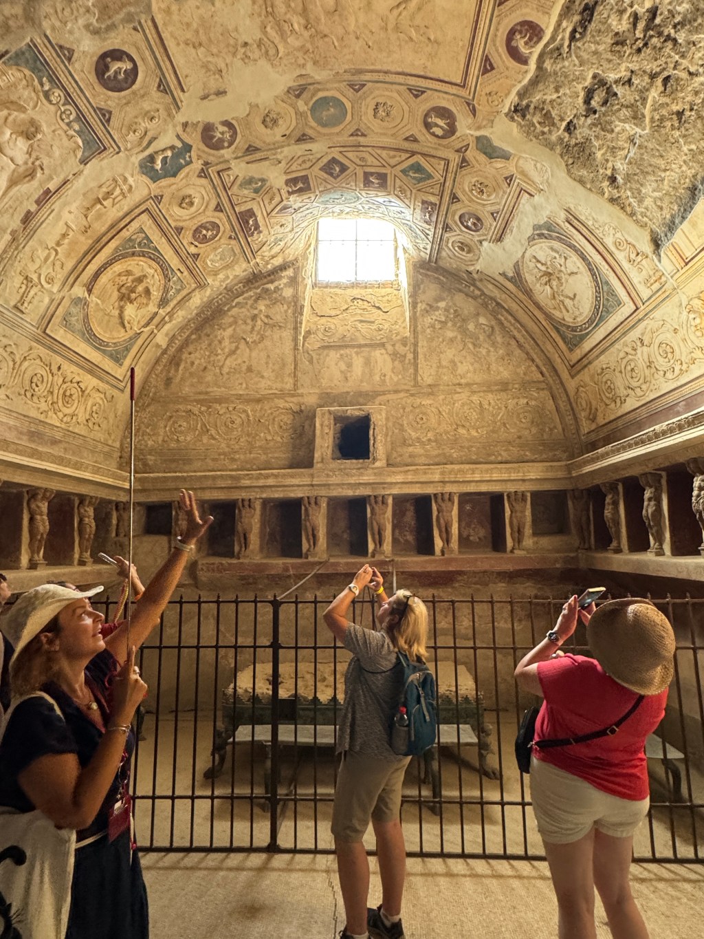 Built in about 80 BC as a popular meeting place for Pompeii residents of all social classes, the Forum Baths had separate spaces for men and women. The tepidarium featured paintings of gods and mythology on the ceiling and clay figures framing niches on the walls for clothing.