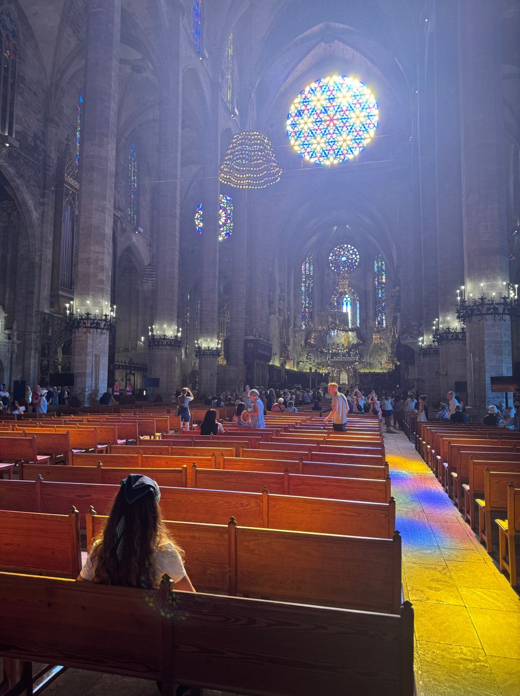 The morning sun shining through the Cathedral’s largest rose window covers the pews (and anyone sitting in them) with bright, pastel hues. It’s also at least 5 degrees hotter in that window’s gleam. All in all, a visual and visceral experience of the presence of God.