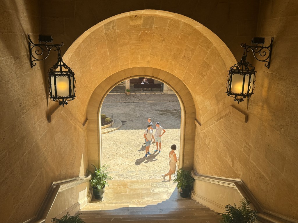 Looking down the stairs to the courtyard of the Royal Palace, the illuminated stones and iron light fixtures give a strongly Spanish feel to the view.
