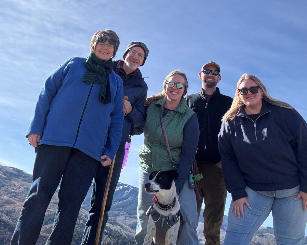 Hiking in the hills above Avon and Edwards, Colorado (at over 7,000 feet), we took a family selfie. From left are Elaine, John, Elizabeth, Jeff, and Hannah, with Elizabeth and Jeff’s bouncy dog Nugget keeping an eye on the other dogs on the trail.