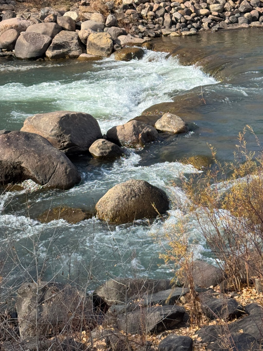 The Animas River flows through Durango, Colorado, bouncing around and over rocks in a stretch of rapids that host whitewater kayaking completions in the spring. The water in November was much calmer, but still pleasant to walk along the banks.