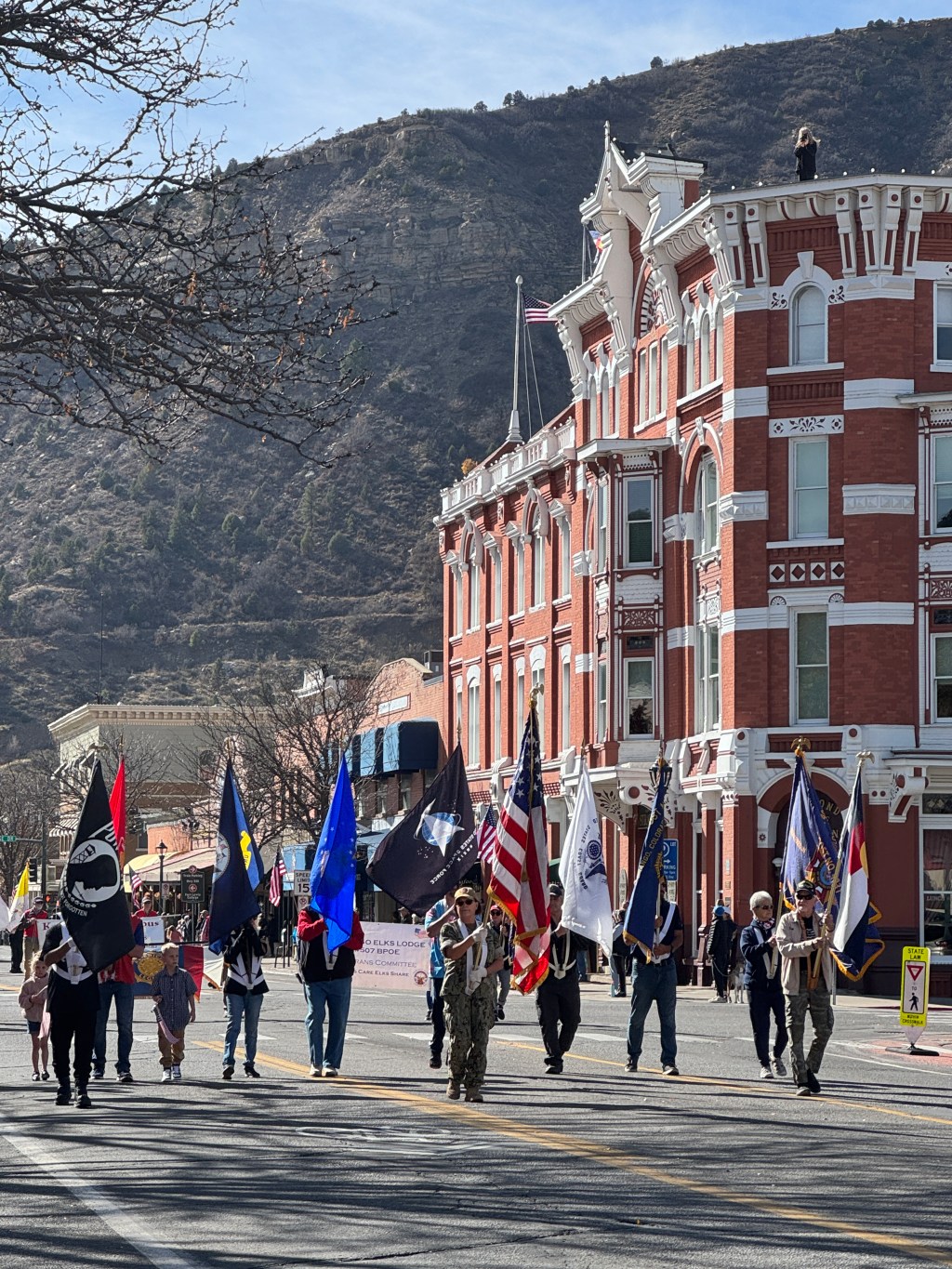 The Veteran’s Day parade in Durango, Colorado passed the historic Strater Hotel built in 1887. Western author Louis L’Amour wrote a number of novels of the Old West in a room directly above its Diamond Belle Saloon.