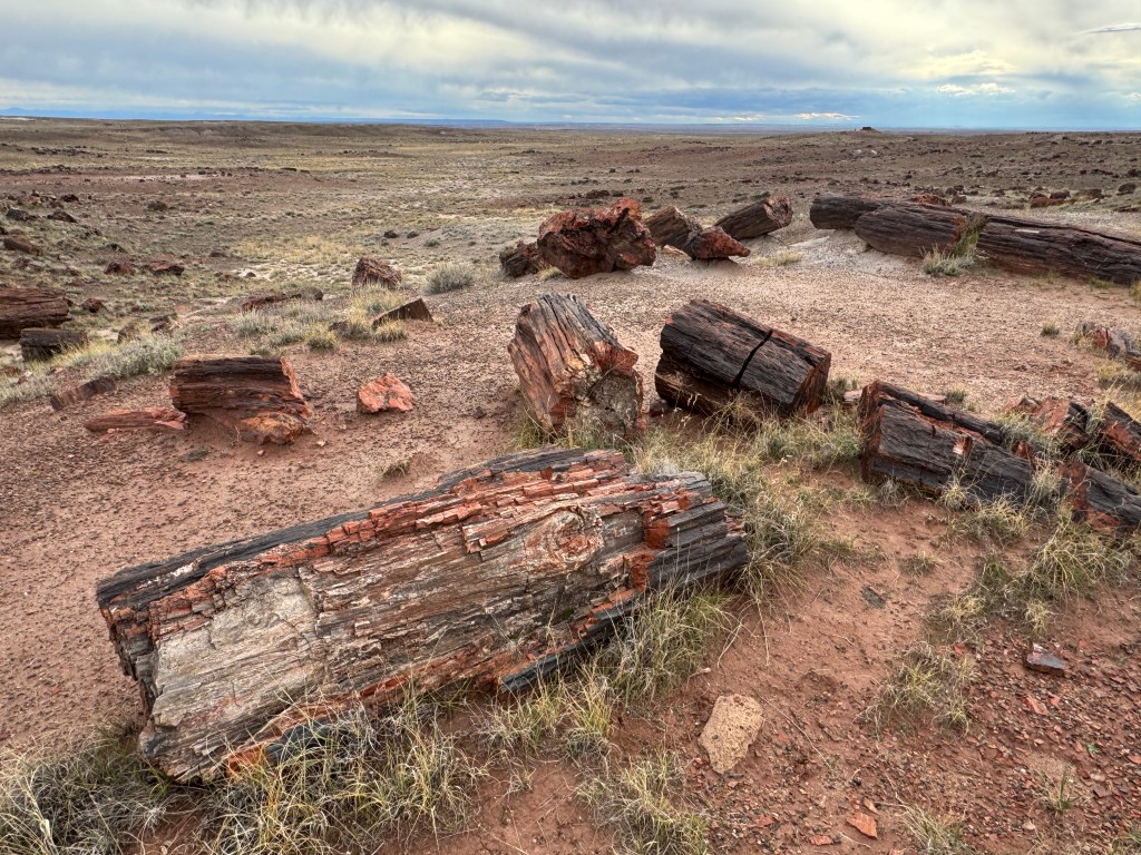 Near the southern entrance to Petrified Forest National Park, we took a two-mile hike on the Long Logs trail past scenes like this of Triassic-era fossilized logs. Hard to picture this dry landscape as a tropical rainforest, but that’s why there are so many trees preserved here.