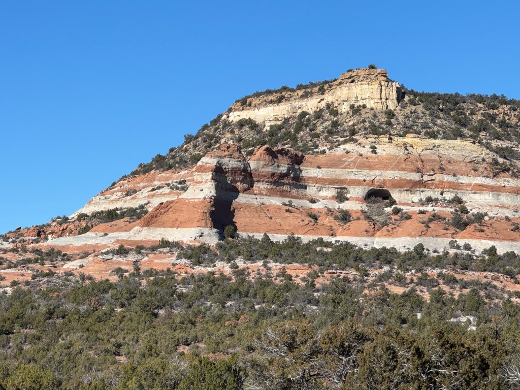 These red and white stripes mark the entrance to the valley of the Zuni Pueblo, about half an hour south of Gallup. We visited Zuni, but everyone was busy cleaning up after their big dancing and feasting celebration a few days before.